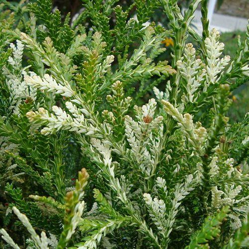 Хвоя этого растения является его основным украшением. Побеги туевика Вариегата широкие и плоские, окрашены в зеленый цвет с кремово-белыми фрагментами. Этот контрастный рисунок придает растению привлекательность. Он прекрасно смотрится как на фоне других растений, так и в одиночной посадке.