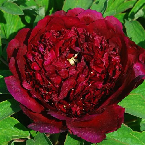 Цветки пиона "Черный лоск" имеют розовидную структуру и крупные размеры, диаметром около 20 см. Они окрашены в красно-черный оттенок с темно-фиолетовой каймой. Цвета яркие и насыщенные. Интересно, что цветки могут быть двухцветными. Общее описание цветка пиона можно описать как красивоцветущий. Форма лепестков также пальчато-рассеченная, а их структура мягкая. Цветы обладают средним ароматом, что добавляет обаяния этому сорту.