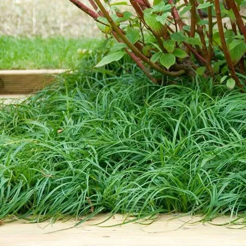 Высота растения — 15–20 см. Ширина — до 30 см. Листья — длинные, тонкие, дугообразные, насыщенно зелёные, блестящие. Весь куст формирует плотную, полусферическую кочку, от которой расходятся изогнутые листья, создавая эффект каскада. Эта текстура особенно выразительна вблизи — на границе дорожек, в контейнерах, в рокариях и на террасах.